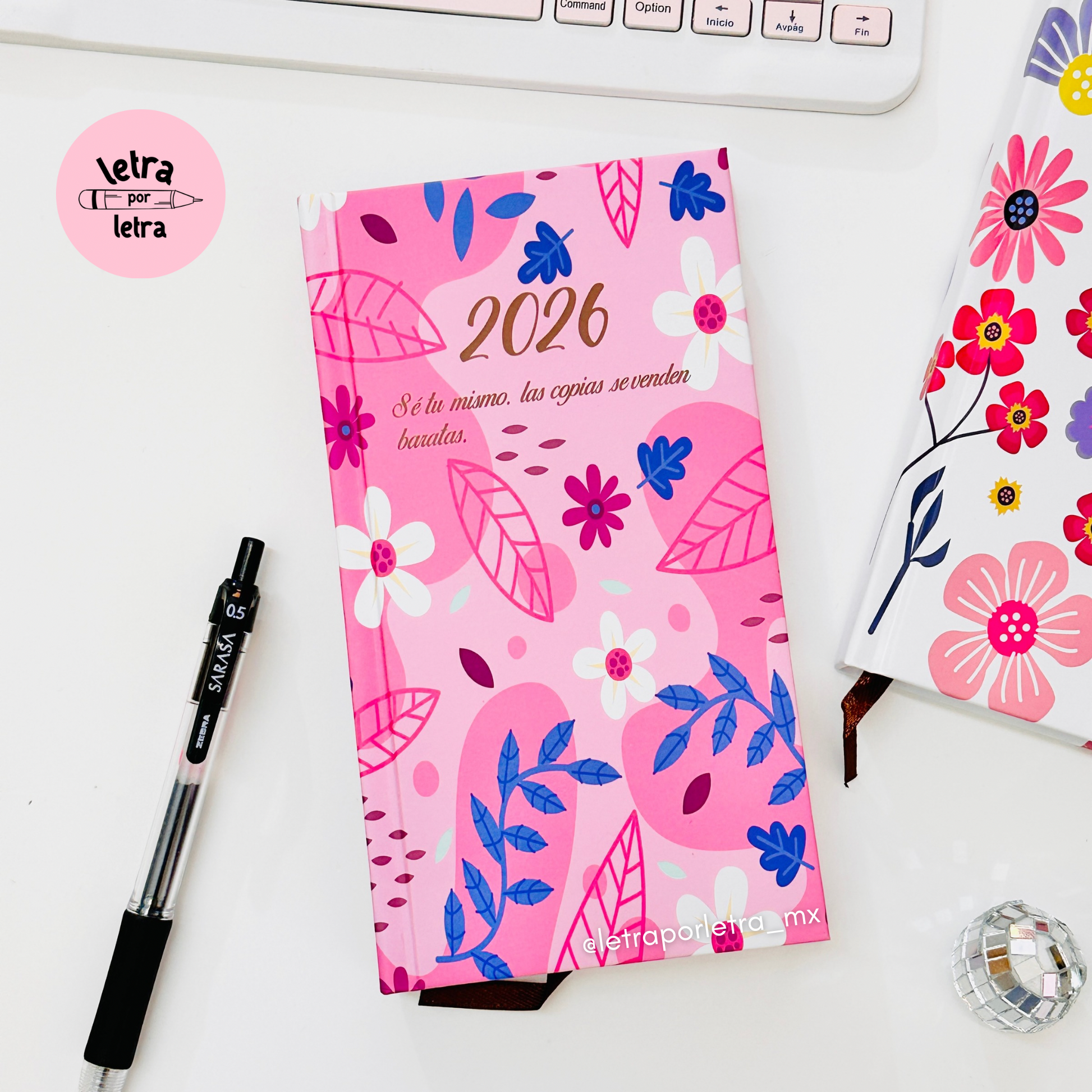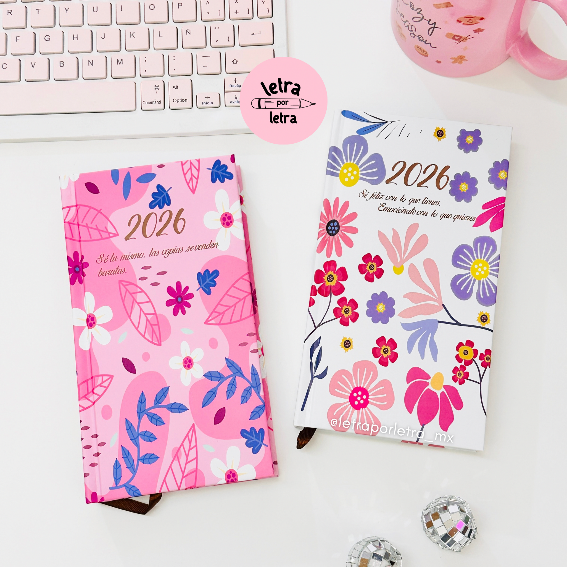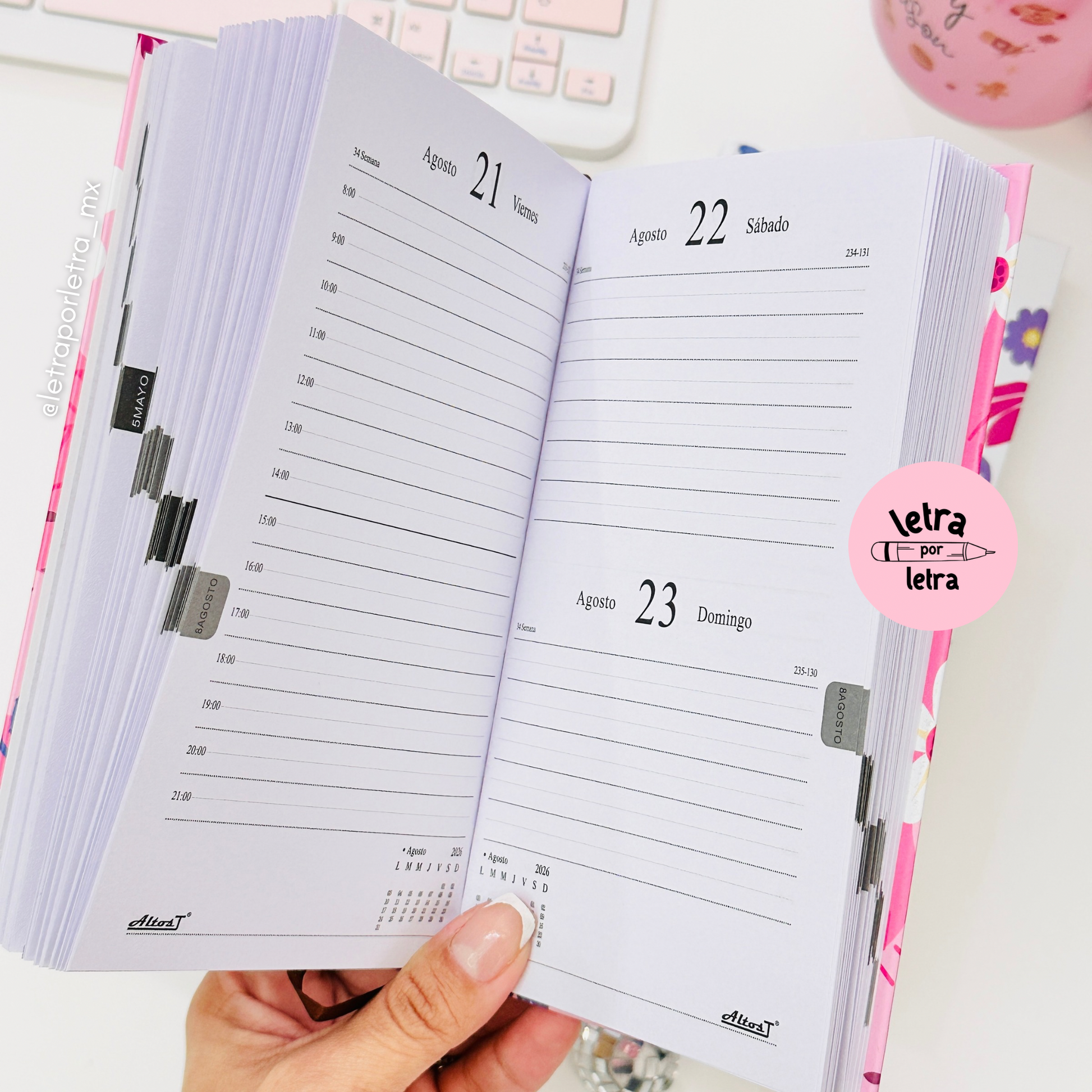 Perfecta para llevar a todas partes. Un día por página de lunes a viernes, sábados y domingo comparten pagina. Calendarios de 2025 a 2029, calendario perpetuo, ladas nacionales e internacionales, factores de conversión, gastos personales, directorio telefónico.