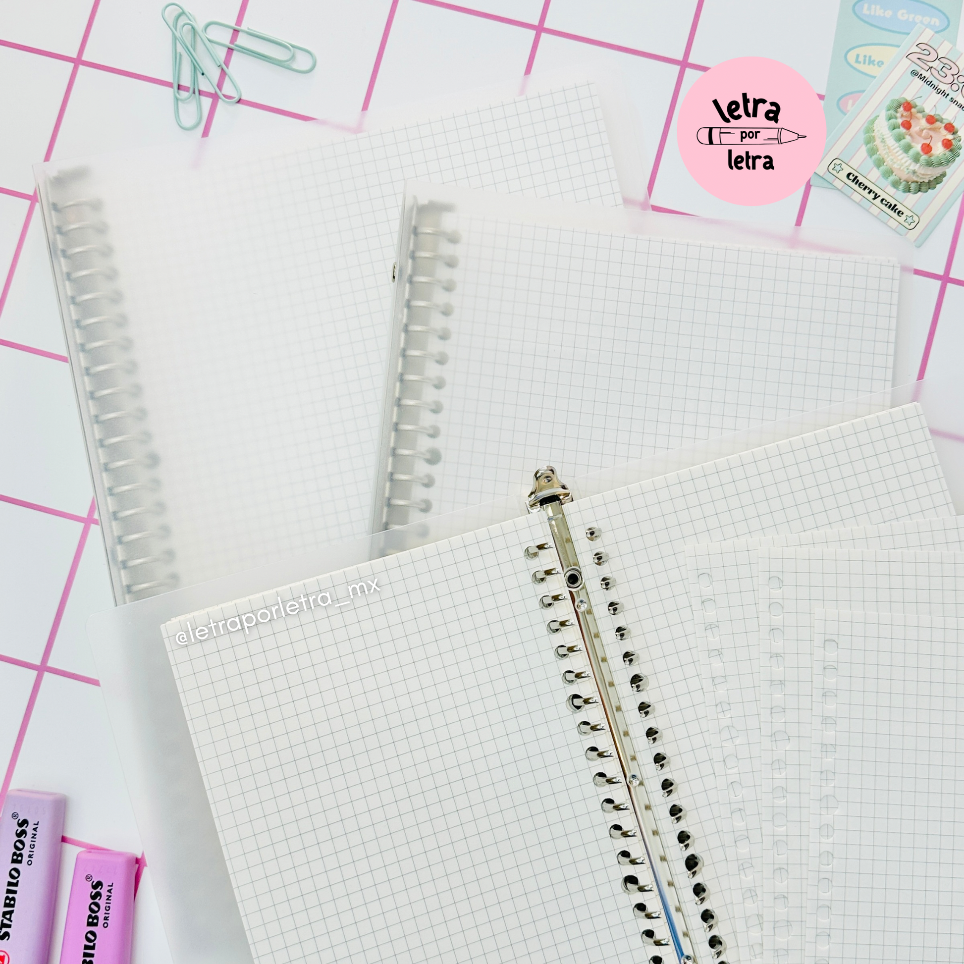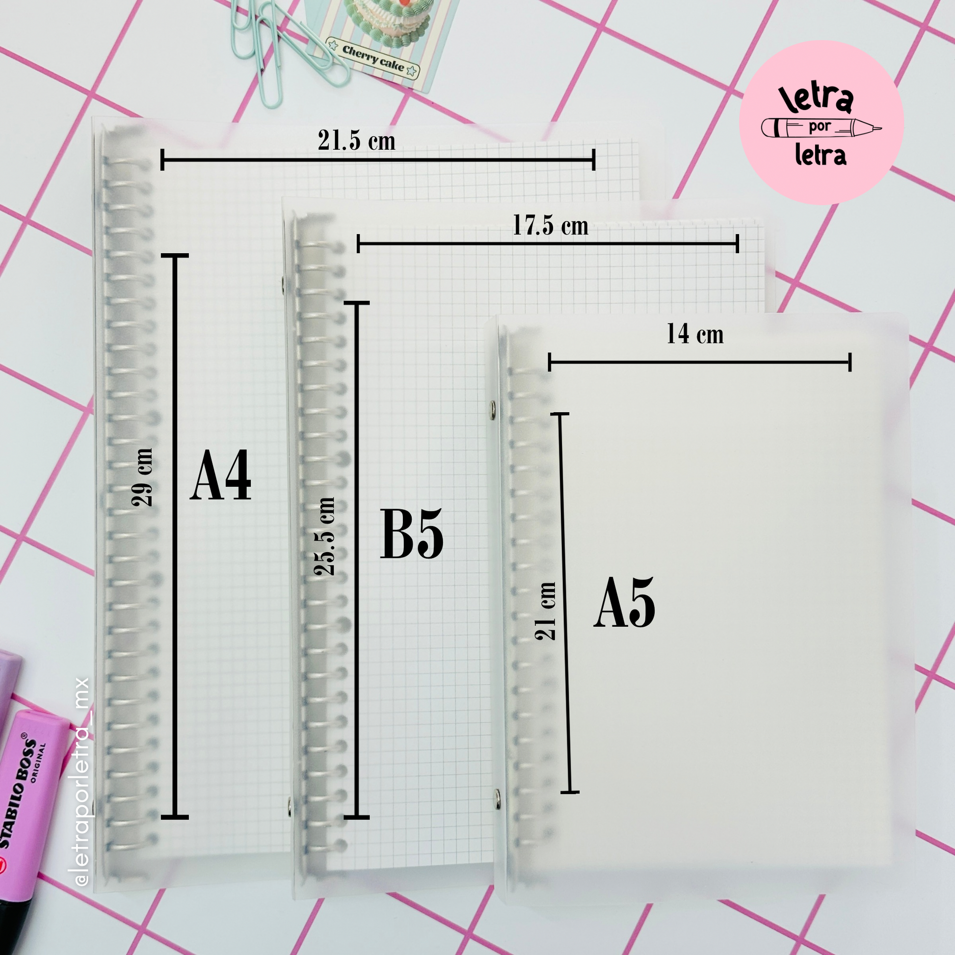 Carpeta de pasta transparente con espiral metálico que puedes abrir para agregar y quitar hojas las veces que quieras. Incluye 50 hojas. Medidas: