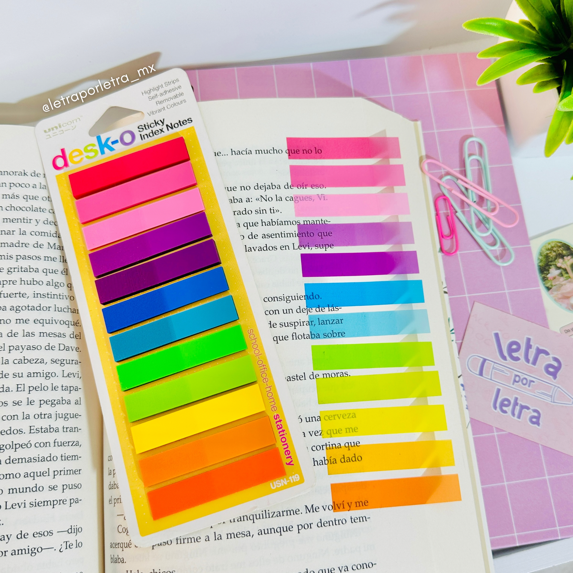 Marcadores de páginas super coloridos. Su acabado transparente permite que los uses también para resaltar texto. Contiene 600 marcadores
