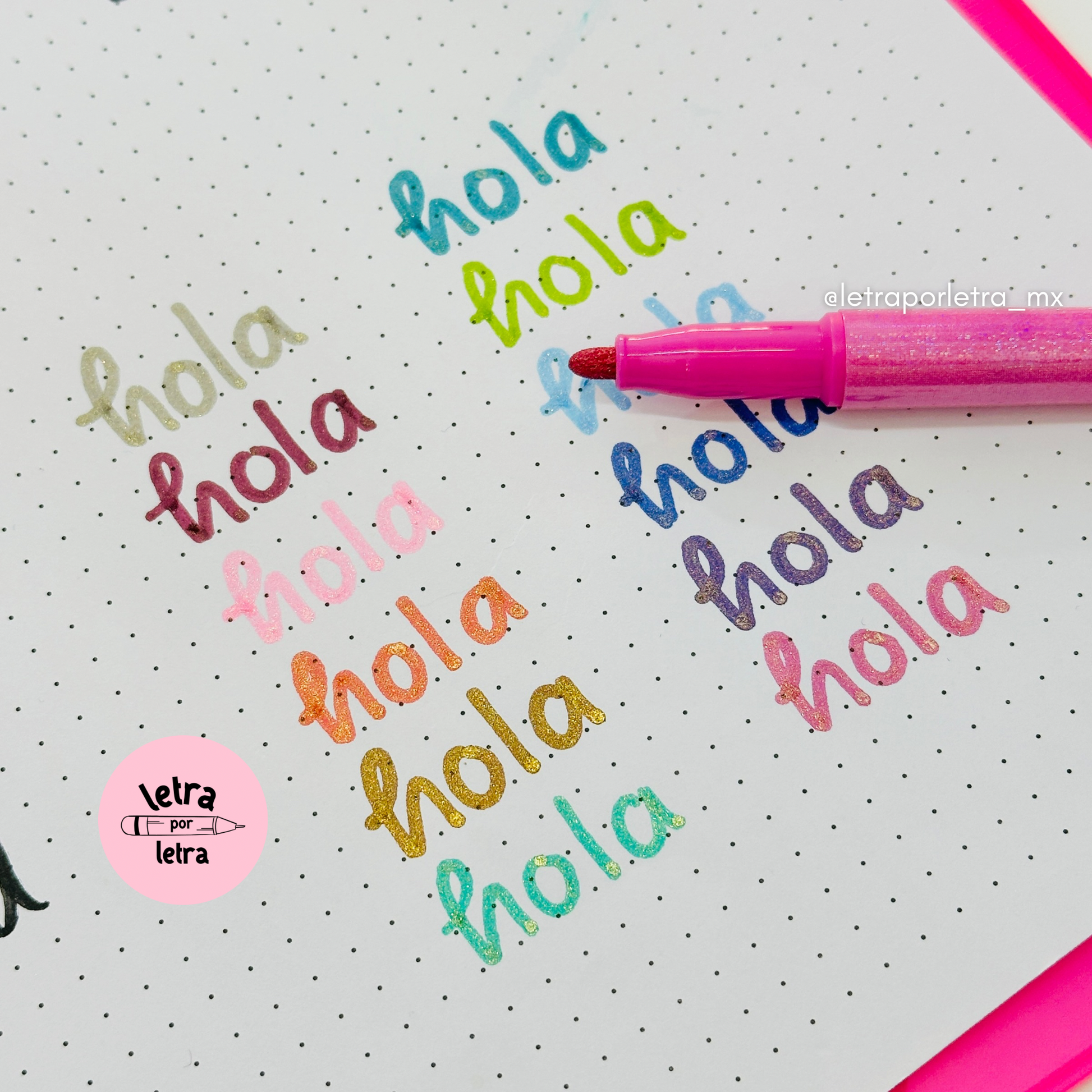Paquete de 12 marcadores con glitter. Punta bala. Efecto tornasol.