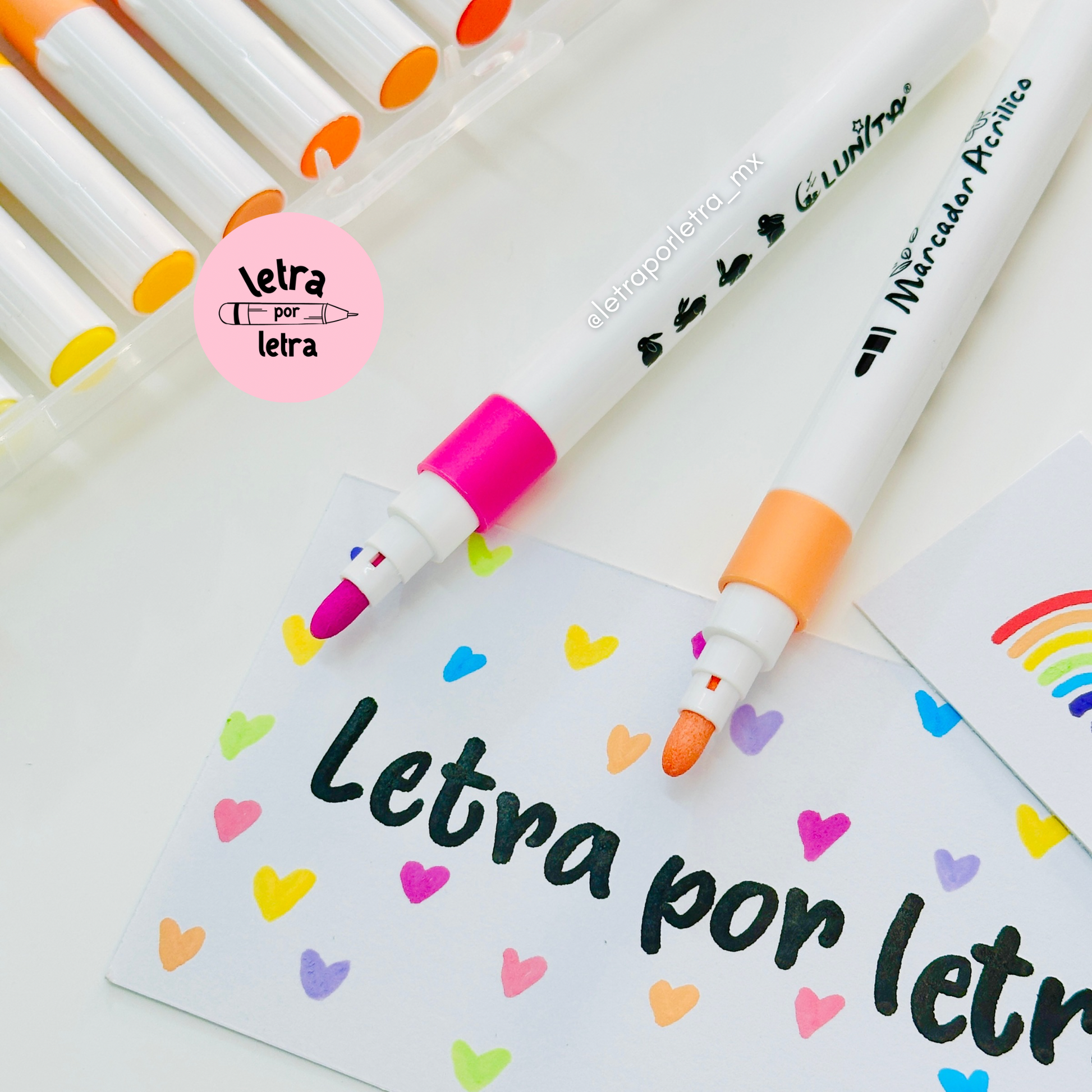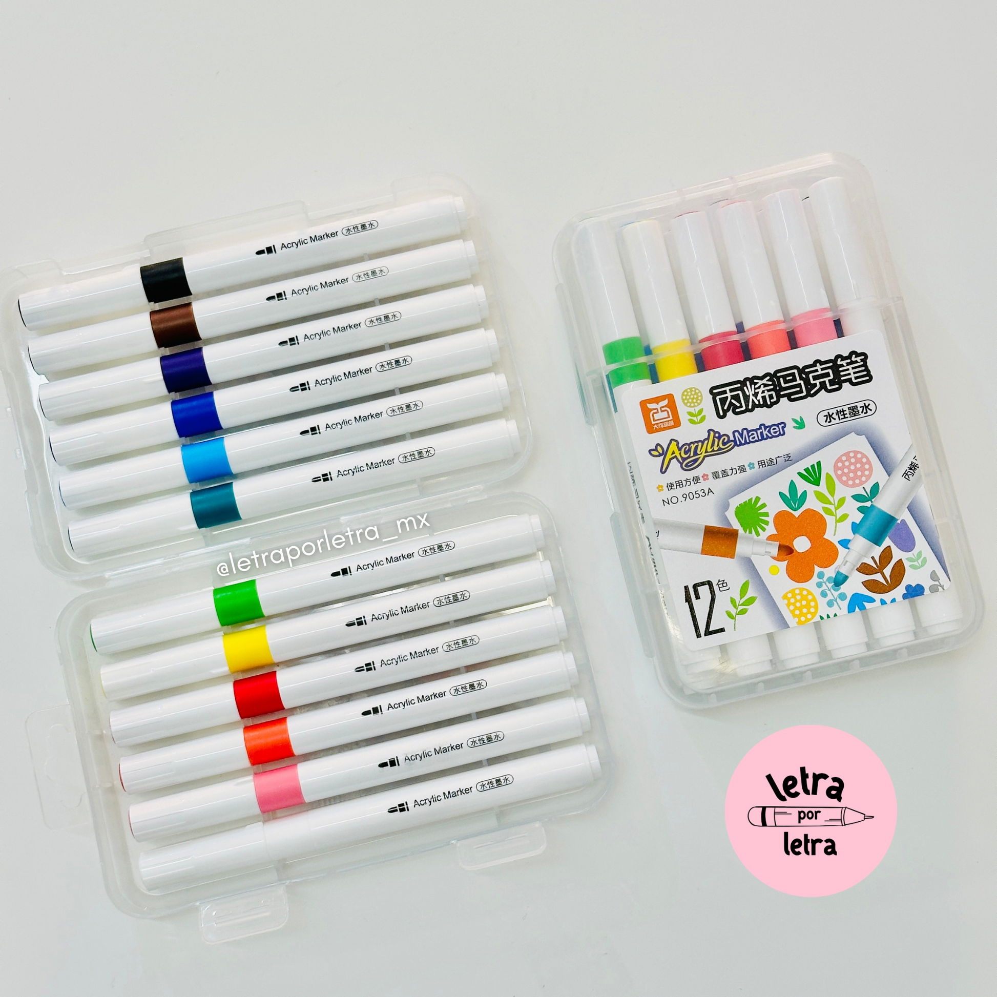 Paquete de plumones de pintura acrílica. Pintan en infinidad de superficies: papel, cartón, vidrio, tela, madera, entre otros. Colores brillantes. Punta bala.