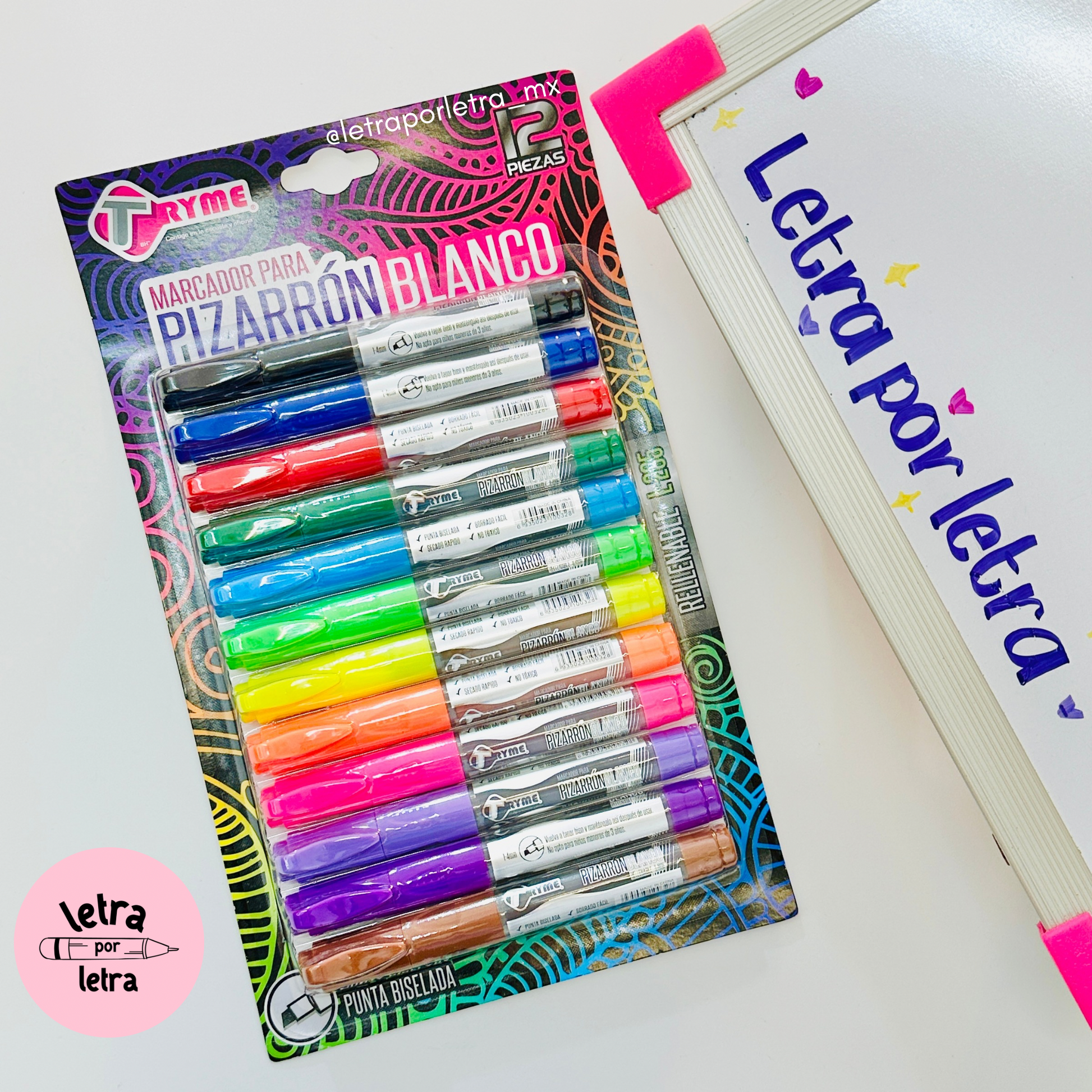 Paquete de 12 plumones coloridos para pizarrón blanco. Punta biselada. Secado rápido. Borrado fácil.