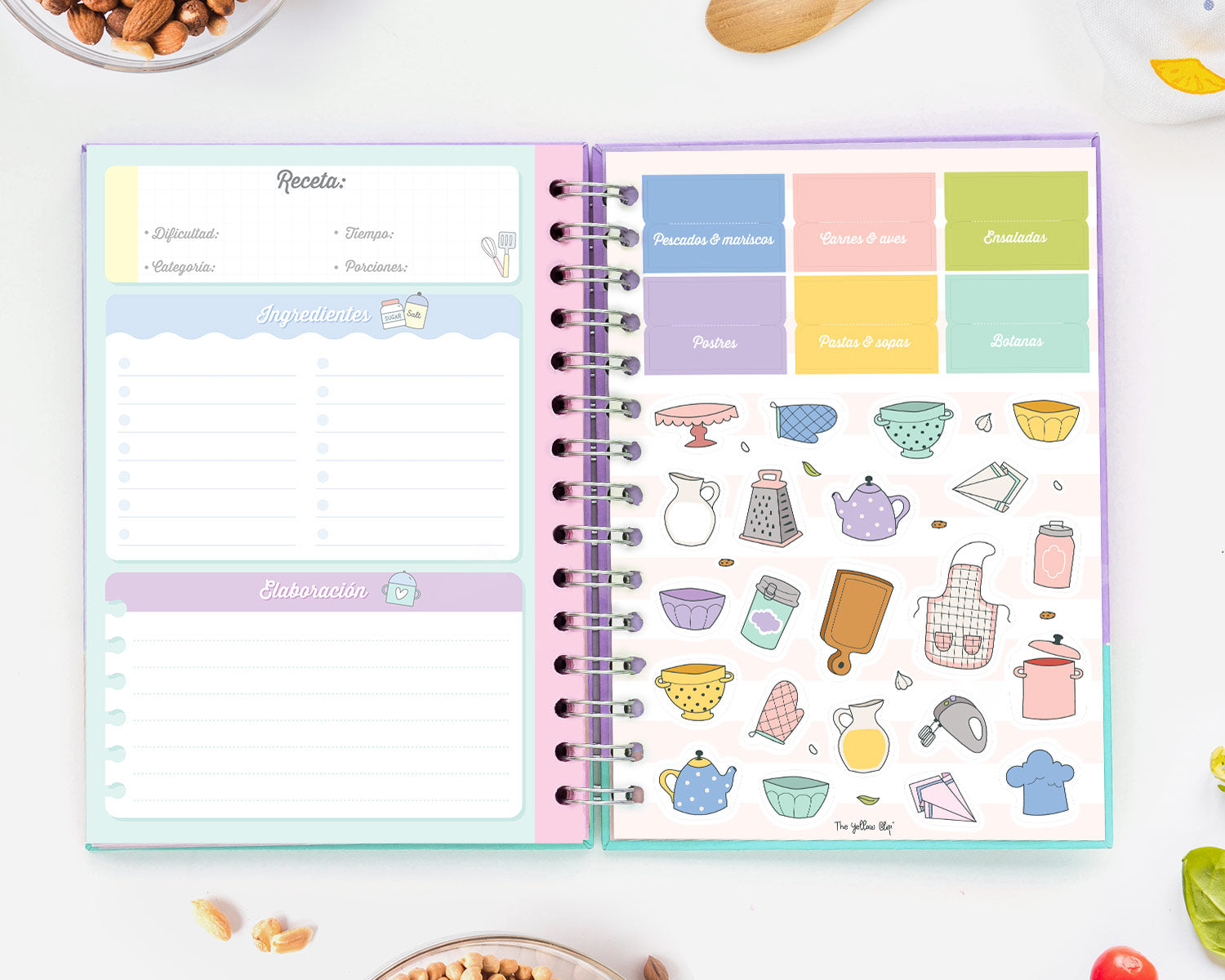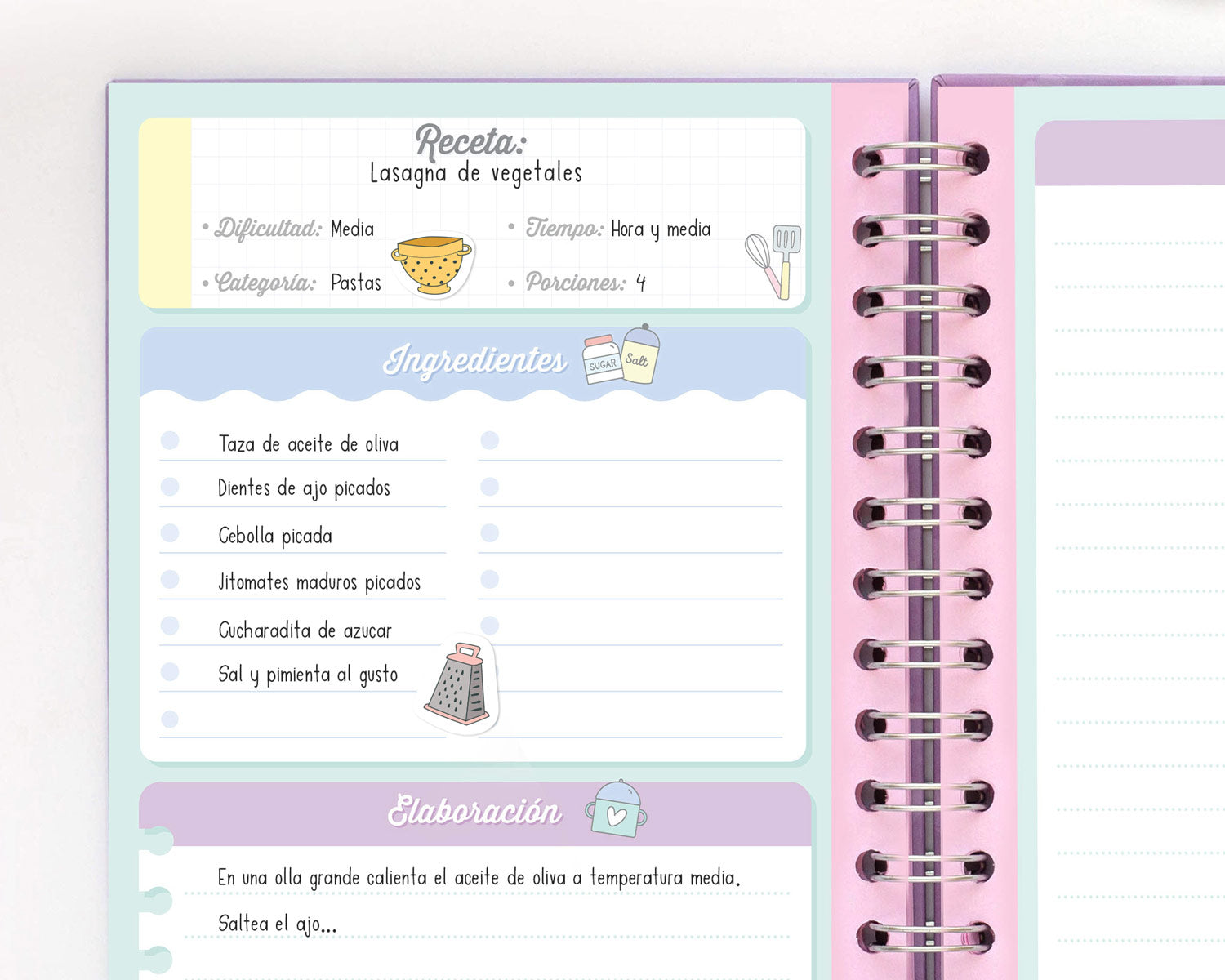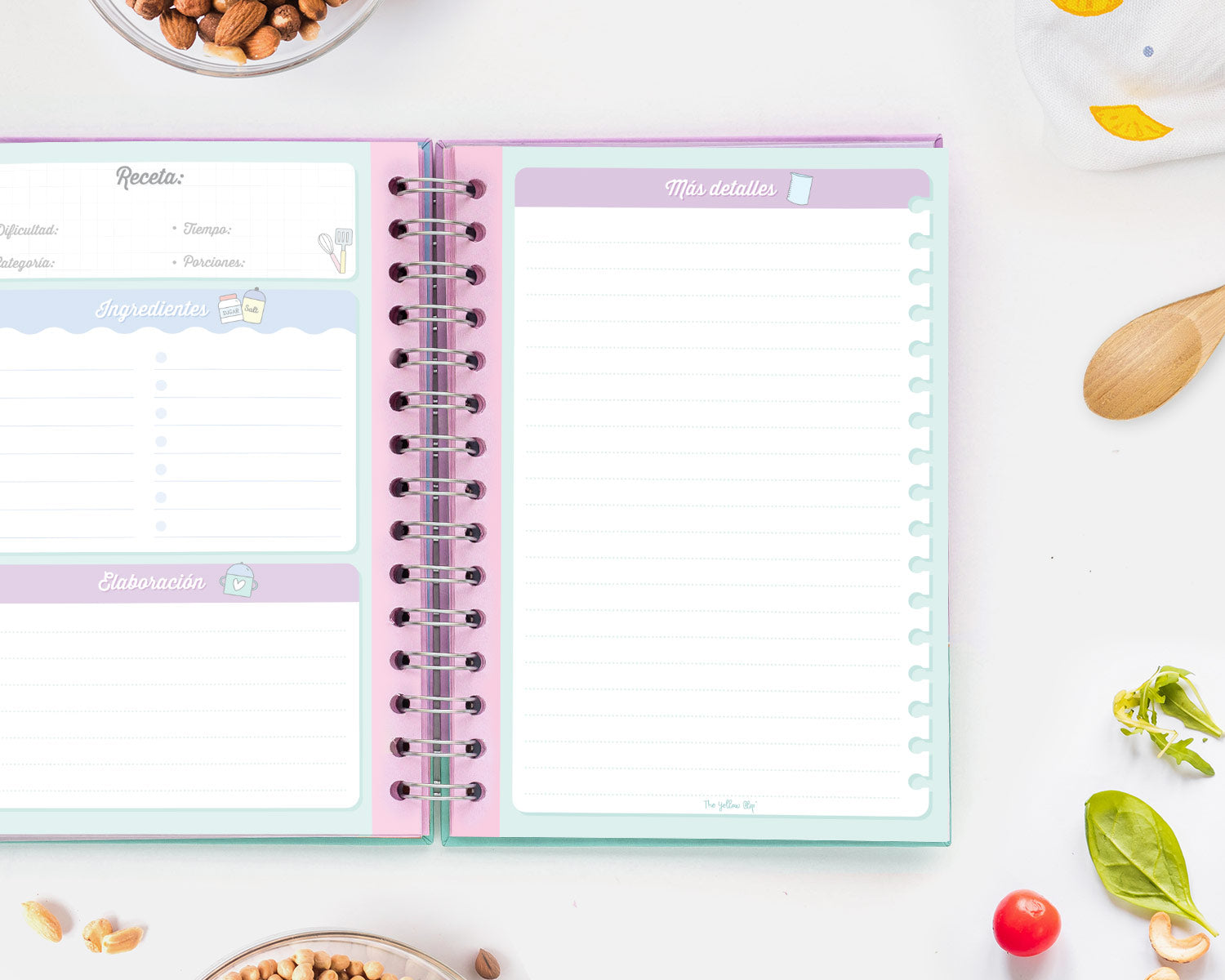 Cada receta tiene dos páginas para que puedas anotar todos los detalles sin miedo a quedarte sin espacio, y en total podrás escribir 100 recetas en tu libreta.