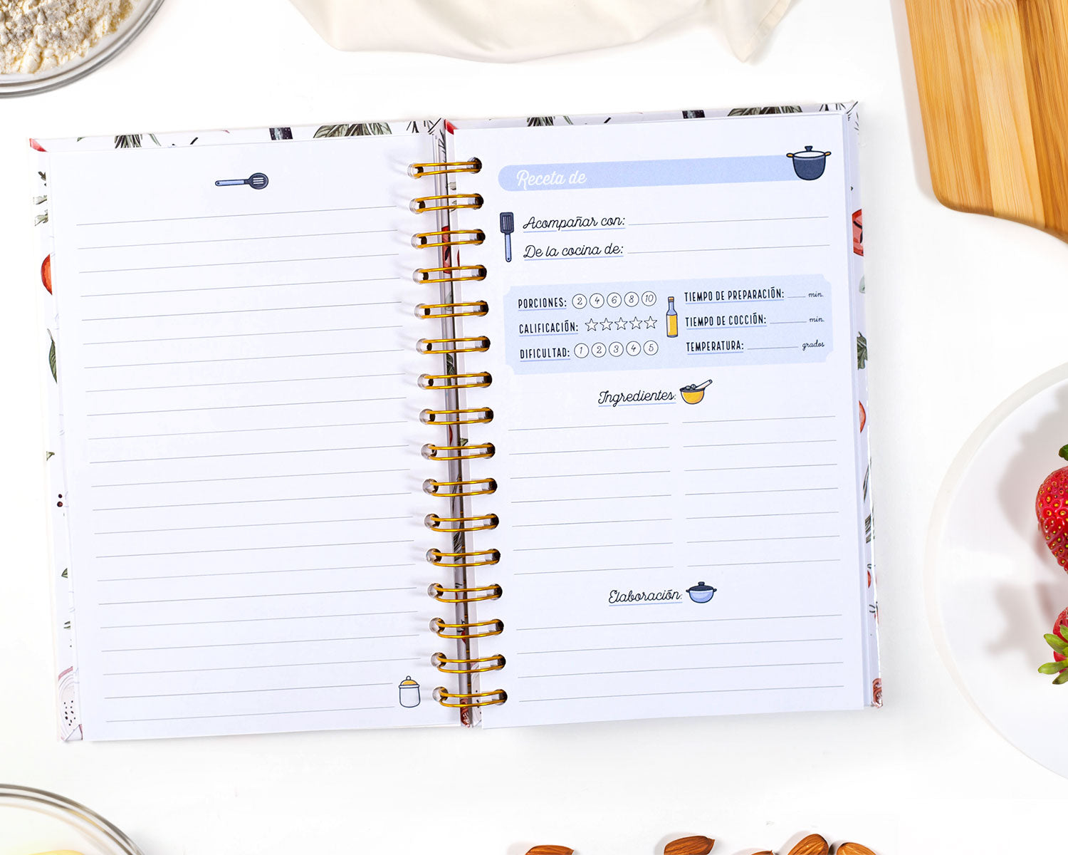 Cada receta tiene dos páginas para que puedas anotar todos los detalles sin miedo a quedarte sin espacio, y en total podrás escribir 100 recetas en tu libreta.
