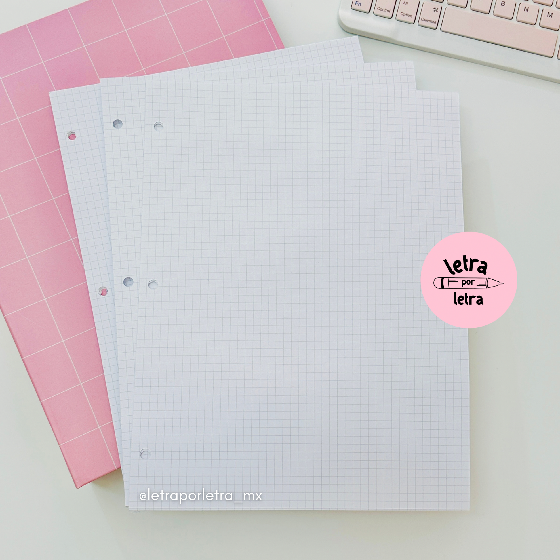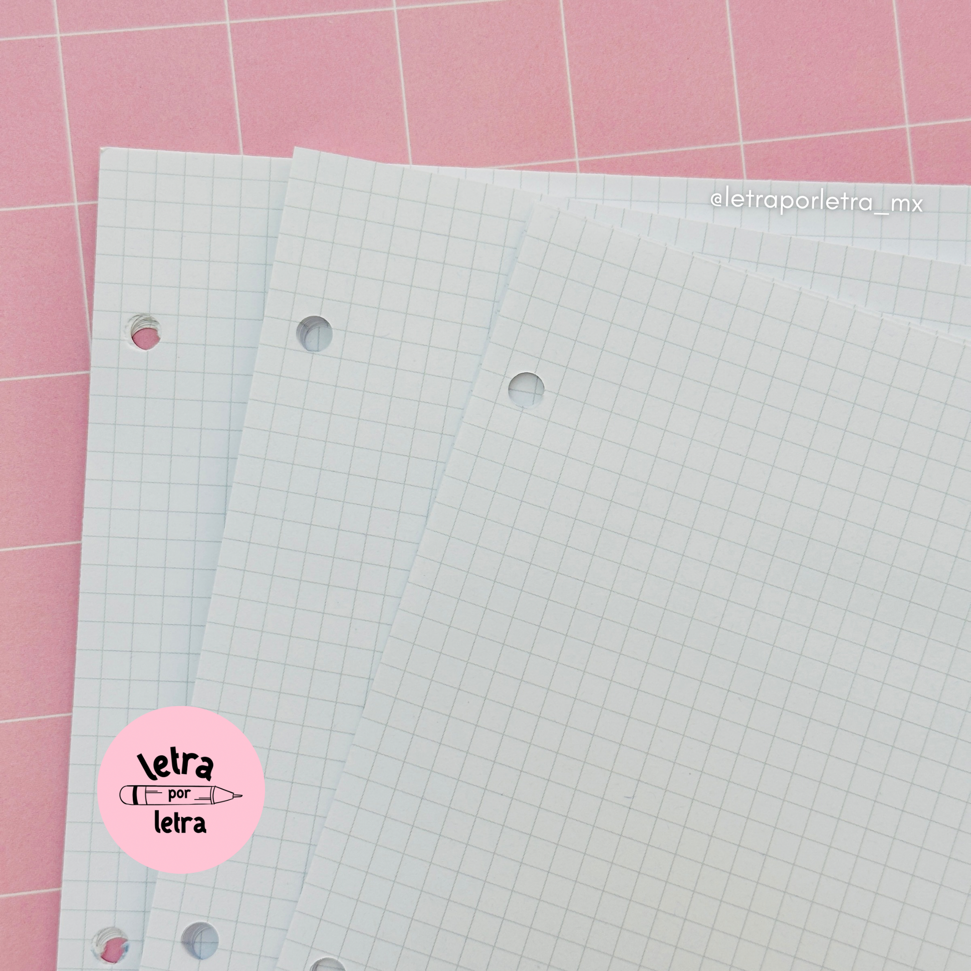 Paquete de 100 hojas de cuadro 5 mm (chico) tamaño carta. Gramaje: 105. Sin margen. 3 perforaciones.