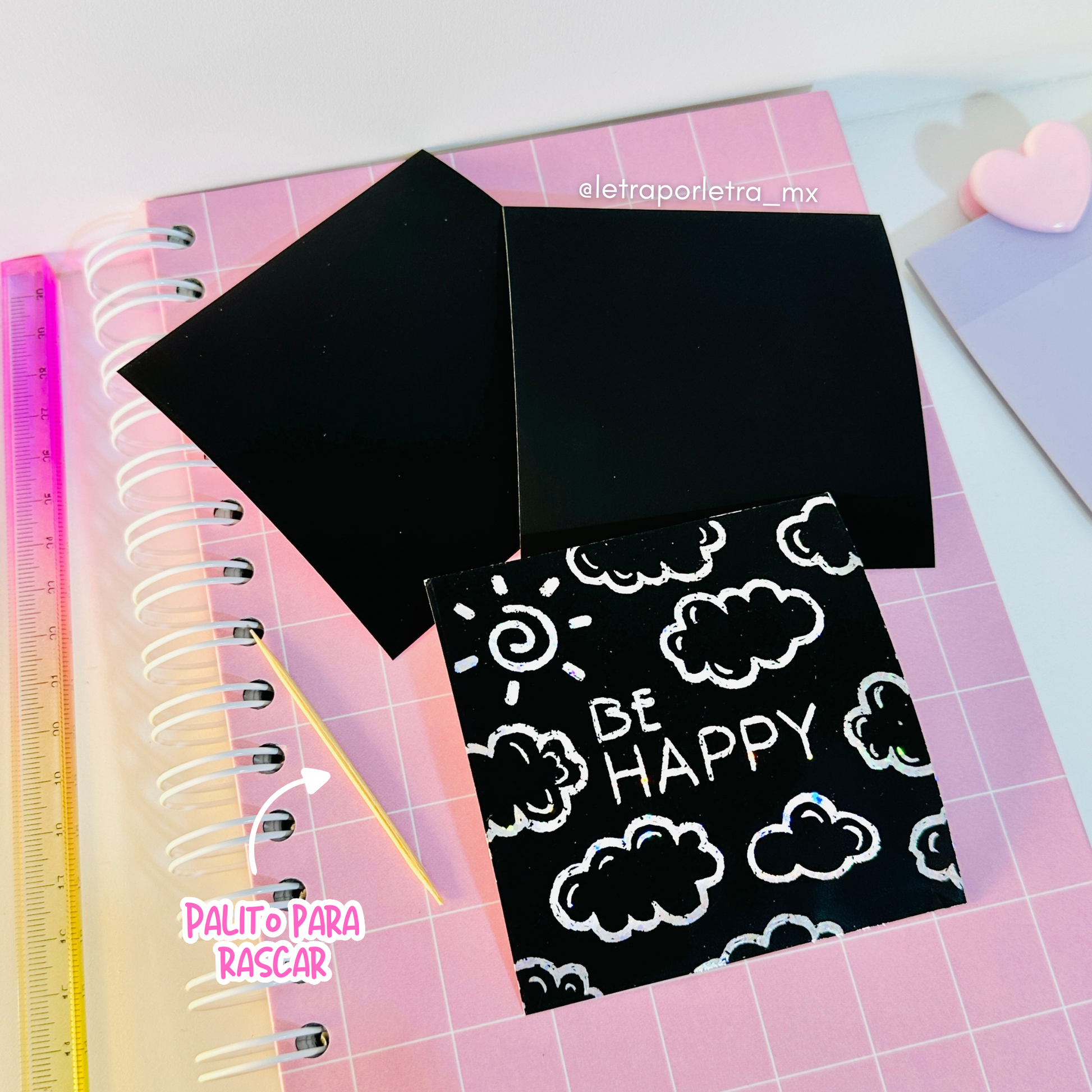 Rasca con el palito para hacer una creación. Contiene 2 hojas de 8.5 cm x 8.5 y un palito