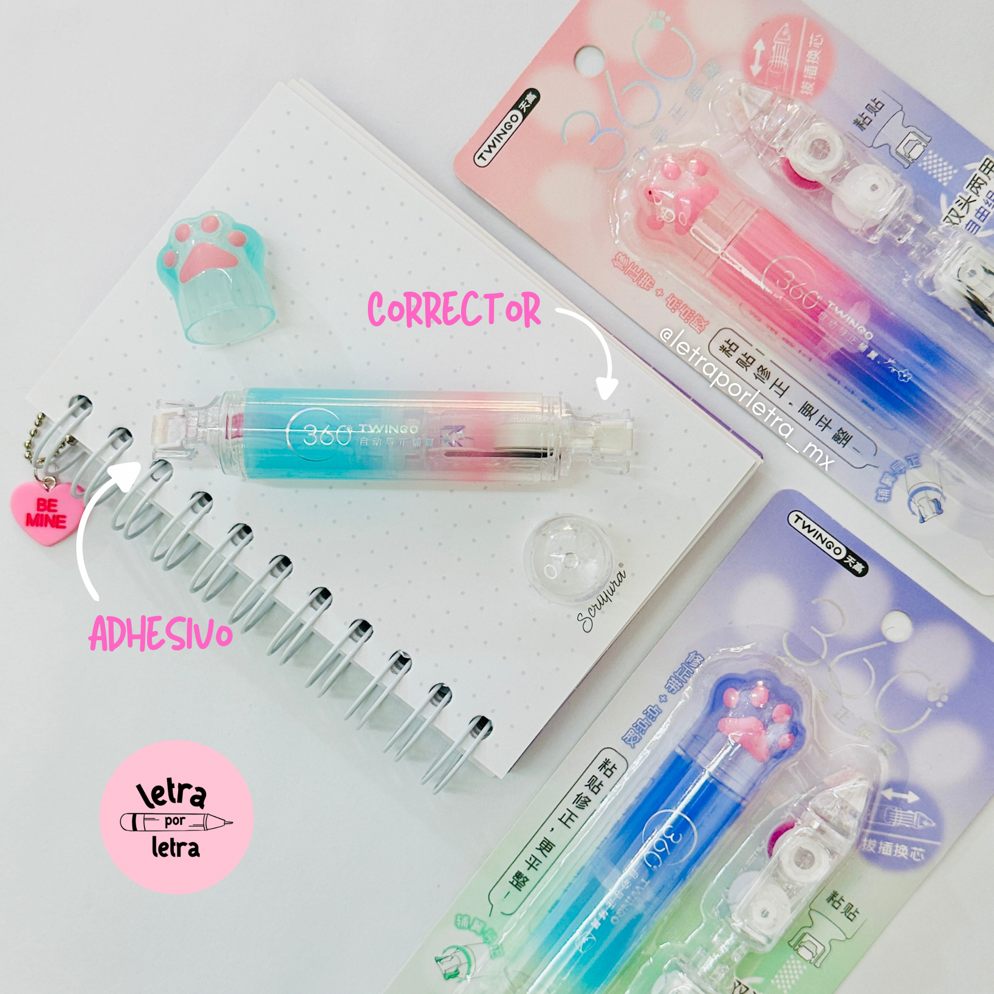 De un lado es adhesivo en cinta y del otro corrector. Los cabezales de ambos giran 360º para mejor uso. Disponible en 3 colores diferentes.