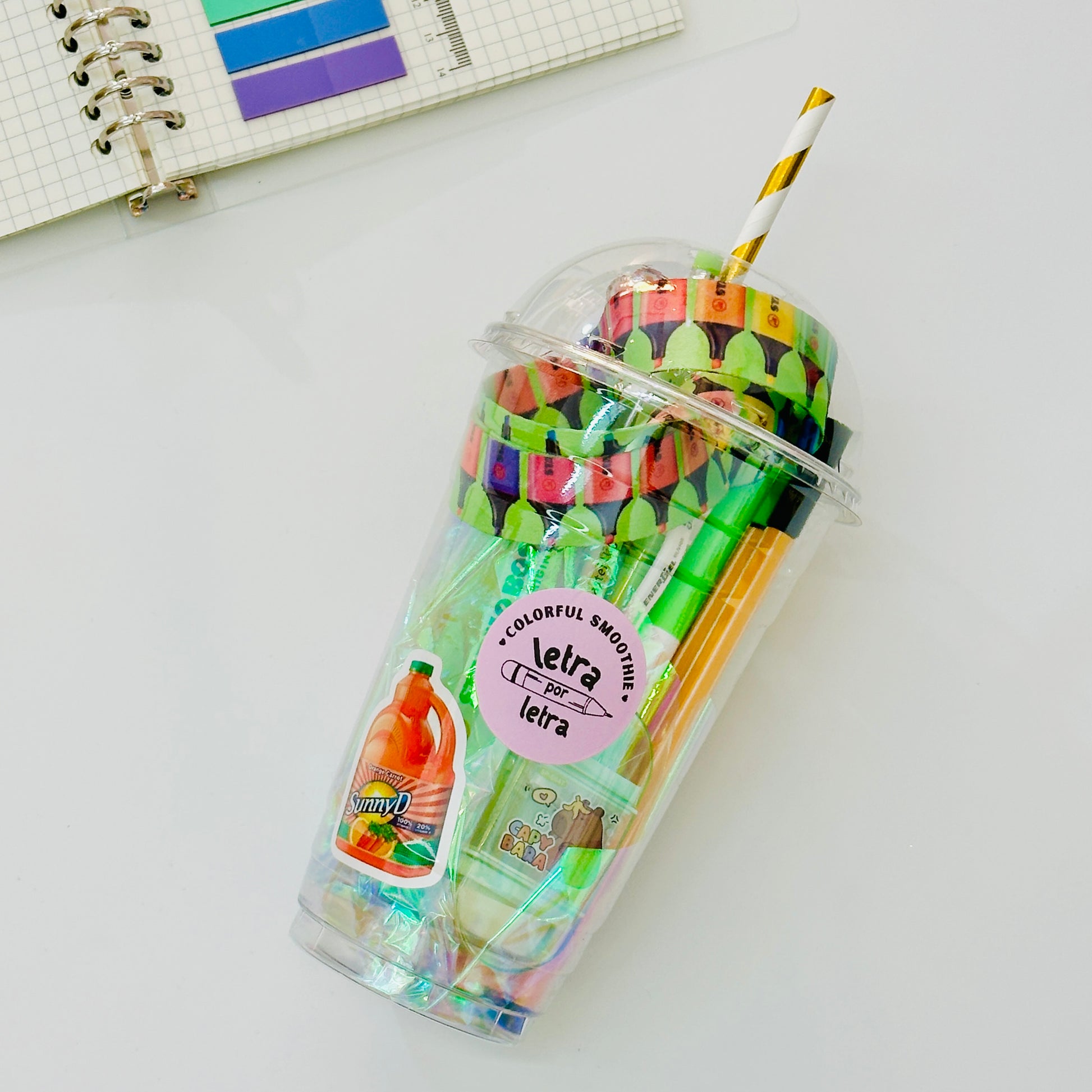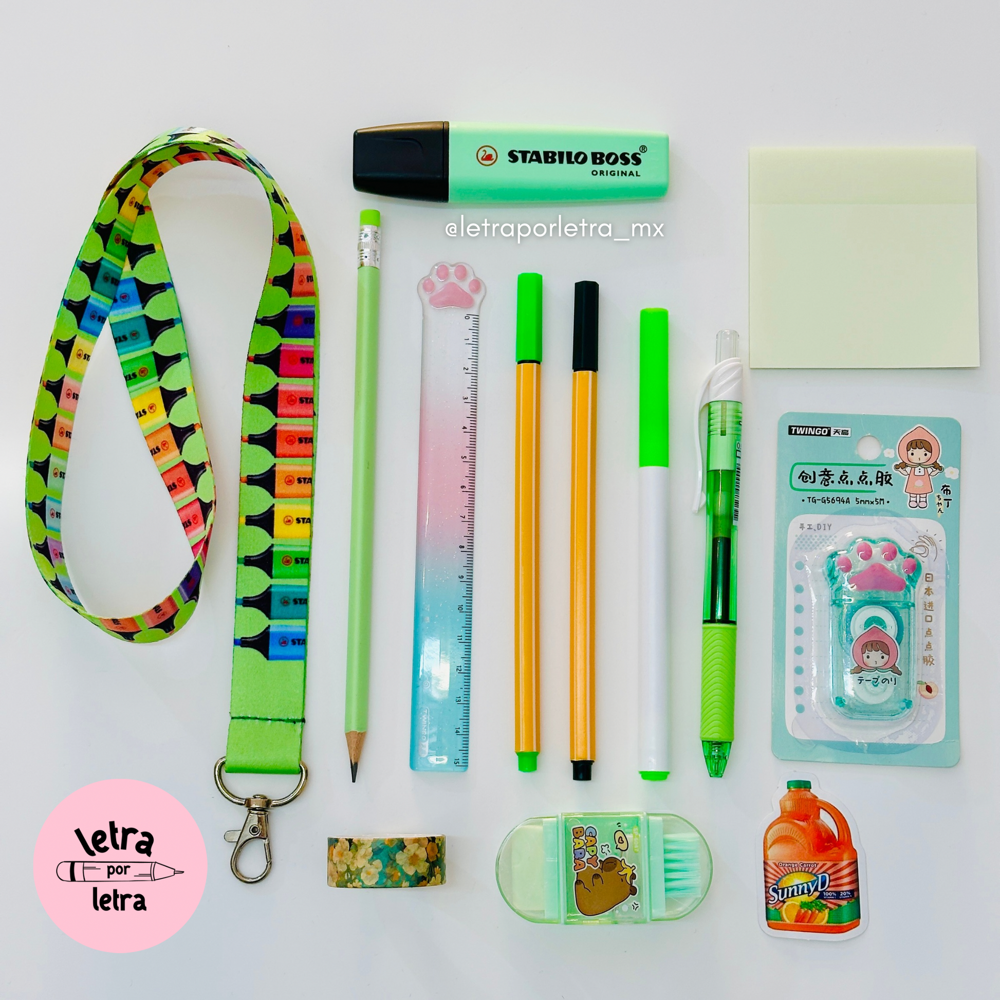 Vasito lleno de papelería bonita. Contiene: 1 lanyard, 1 lápiz, 1 regla, 2 rotuladores fine line, 1 plumón Super tips, 1 pluma Pentel Energel, 1 Stabilo Boss, 1 sticky notes transparente, 1 washi tape, 1 sacapuntas-goma capibara y 1 sticker.
